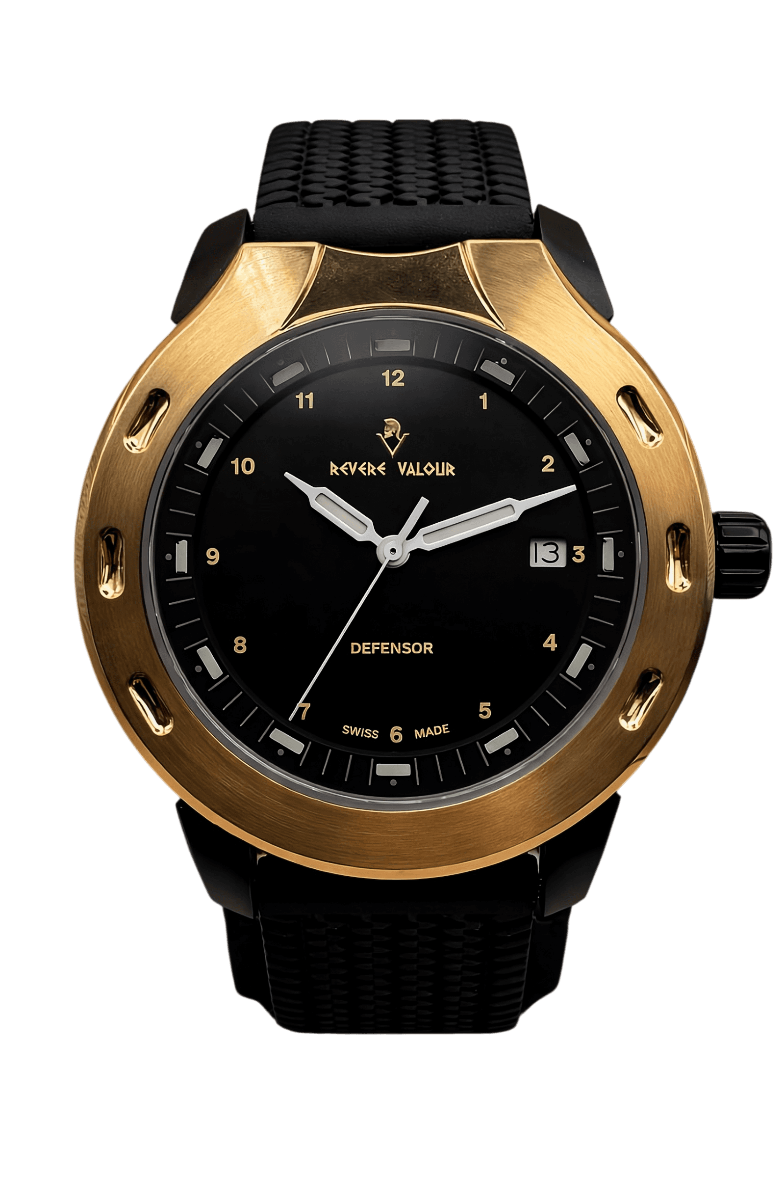 The bold black dial contrasts with luminous markers, while the golden bezel frames the watch like an emblem of success.